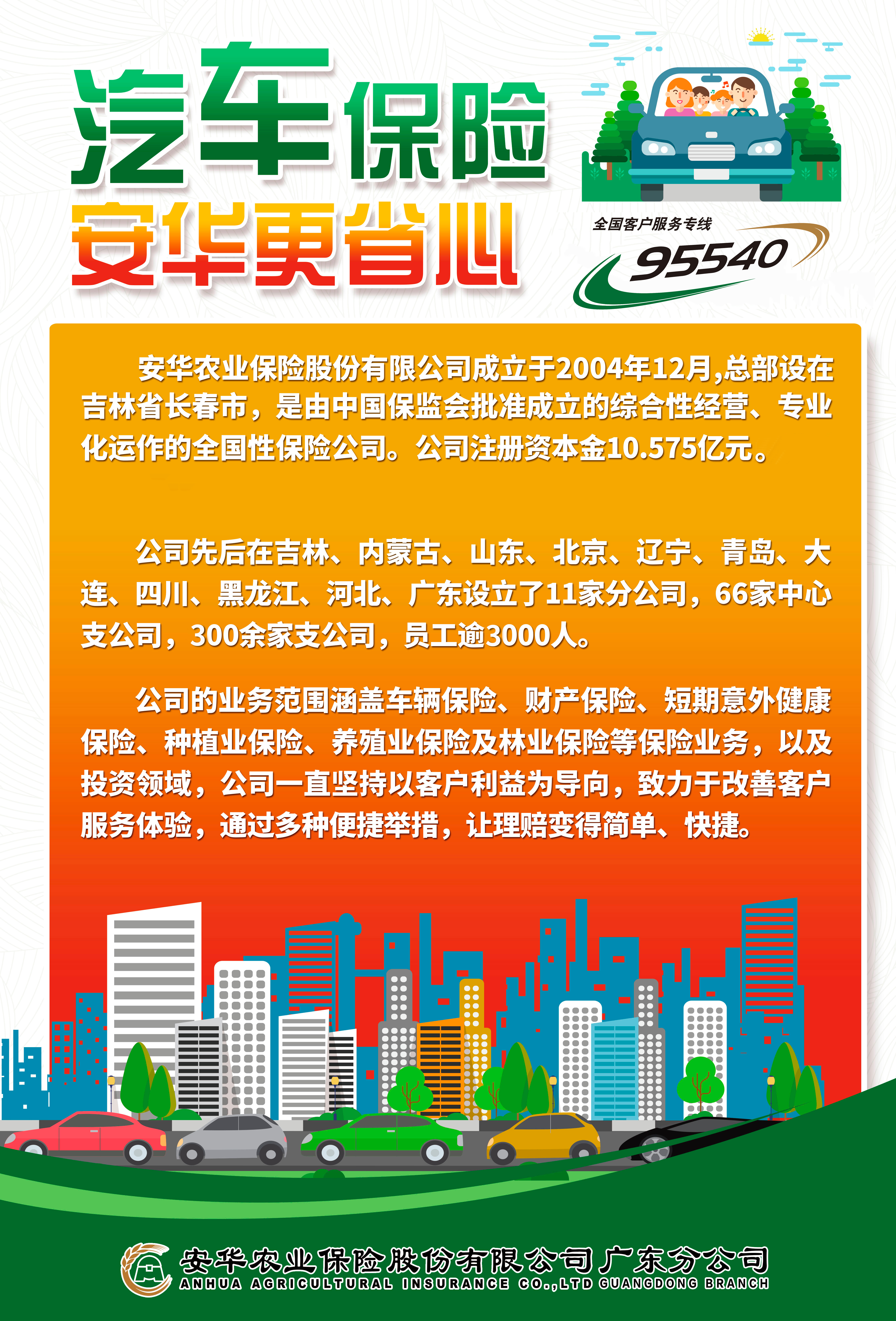 安华农业保险股份有限公司于2004年成立,注册资本金为10.575亿元,总部设在吉林省长春市。目前,公司总部内设21个职能管理部门,下辖吉林、内蒙古、山东、北京、辽宁、青岛、大连、四川、黑龙江、河北、广东11家分公司,66家中心支公司,300余家支公司,员工逾3000人,公司年保费收入跃上65亿元平台。公司是国内首批设立的专业农业保险机构,也是2007年第一批参与中央财政农业保险试点的主体之一。